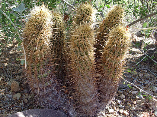 Leding's hedgehog is a rare species found in scattered locations in southeast Arizona, between 4,000 and 6,500 feet, such as the Chiricahua and Pinaleno mountain ranges. The plant is quite distinctive, not resembling other hedgehog species in this area; it forms small clusters of tall, thin, cylindrical stems, each up to 18 by 8 inches in dimensions, covered by thick, golden yellow spines, which become darker with age. The central spines number up to 11, and curve downwards slightly. The green color of the stems is usually visible, though in dry conditions the plants shrink, and appear more densely spined.