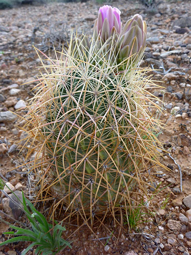 Bright magenta flowers, up to 2.5 inches wide, are produced in spring (March to May). Stamens are yellow, the stigma lobes yellow to pale green. Western populations tend to have yellow flowers, and are sometimes considered to be a distinct variety (var lutescens). Tepals have flat or rounded tips, not pointed. The cylindrical stems reach a height of 10 inches and are usually single though may form offsets. This species is one of the largest of the pineapple cacti.