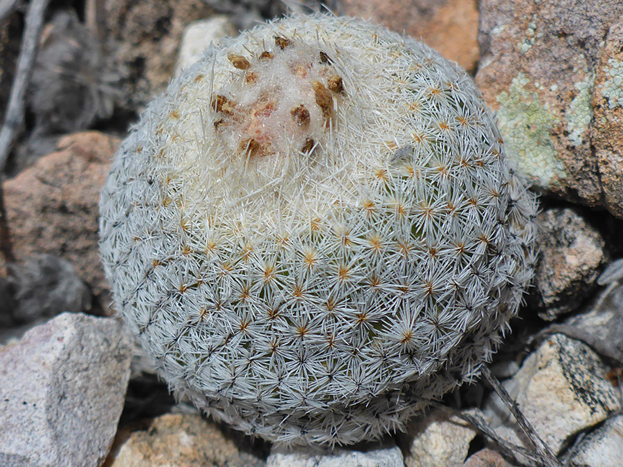 Withered flowers at the tip of a stem of epithelantha micromeris: Apache Canyon Trail, Big Bend National Park, Texas