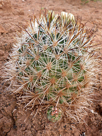 The spherical, egg-shaped or cylindrical stems can be relatively large, up to 4 inches in diameter and 10 inches tall. Radial and central spines are well-differentiated; the former, between 11 and 15 per areole, are around half an inch long, while the latter, between three and seven, are noticeably longer, one inch or more. Radial spines are all-white, central spines are brown when young, becoming pale gray as they age.