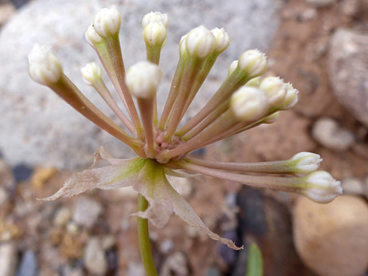 Stems may point vertically upwards or lean over, and usually have a covering of short glandular hairs. Leaves are quite thick, and sometimes have slightly wavy margins; they are also lightly hairy, this most evident on the undersurfaces. The inflorescence is a spherical cluster of between 25 and 75 flowers, subtended by five or more ovate or obovate bracts, which at flowering time are thin and papery. Flowers consist of a narrow, pinkish tube up to 0.8 inches long, topped by five small white lobes.