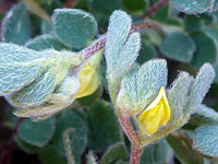 Acmispon brachycarpus is one of the more distinctive deervetch, or deerweed species as its pea-like, orange-yellow flowers are borne singly from the leaf nodes, are sessile, and are rather smaller than the surrounding leaves. Plants are generally prostrate, and often form mats, Stems and leaves have a light to dense covering of silvery hairs. Leaves are quite thick and fleshy, approximately oval in shape, with pointed tips.