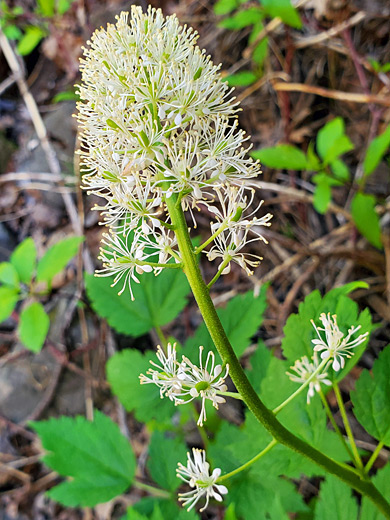 Stems may branch a few times, above the middle. Leaves (one to four per plant) are ternately divided two or three times into sharp-toothed leaflets. Stems usually have a sparse covering of short hairs; leaves are glabrous.