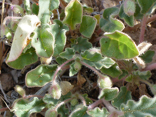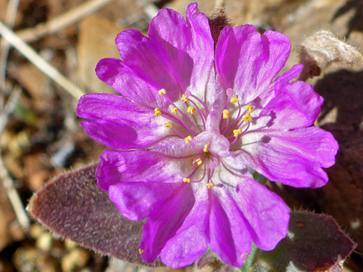 Allionia incarnata is an easily-recognized species that produces long stalks growing along the ground, with bright pink flowers at intervals, amongst larger green leaves. What appears to be a single flower is actually a cluster of three, each with three petals, split at the ends, so the overall appearance is of a flower with 18 petals. Stamens are reddish-pink, topped with small, spherical yellow anthers. Leaves are often reddish at the edge, and tend to have wavy margins. The plant favors sunny, semi-desert locations, ranging between south California and Texas.