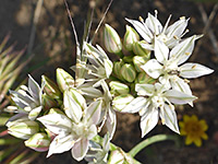 The six tepals of flowers of allium lacunosum are lanceolate to ovate in shape, narrow at the base, and colored white (usually) to pink, with darker midveins, often greenish. All are equal in shape, radiating outwards from the center, forming a widely bell-shaped flower. The six stamens have white filaments and pale yellow anthers, and are shorter than the tepals; they surround a short, white or pink, three-lobed ovary with a linear style, similar in length to the stamens. The compact umbels contain between five and 45 flowers, and are subtended by two of three thin bracts, crossed by four to six veins.