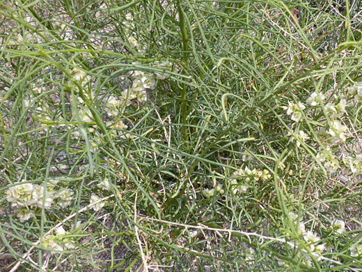 Flowerheads of ambrosia salsola are small, and relatively short-lasting; more prominent are the fruits, which are enclosed by thin, lightly-veined wings, arranged in a whorl or spiral, initially colored white, maturing to purplish. The wings number up to 18, and are about a third of an inch long; narrow at the base and broader above. Leaves are narrow and linear, forming a tangled mass together with the slender, branched stems. The upper leaf surface has a prominent, lengthwise groove.