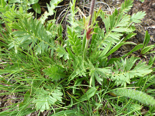 Anemone multifida usually has between three and six basal leaves, attached by stalks of up to 4 inches. The blades are similar in length, and are ternately divided, usually twice, into narrow, pointed lobes. The lower leaf surfaces are sparsely covered by long white hairs; the upper surfaces are mostly hairless. Stem leaves are smaller, few in number, less divided, and sessile; they form a whorl a little way below the inflorescence. One plant produces up to seven stems, which also have a sparse hair covering.