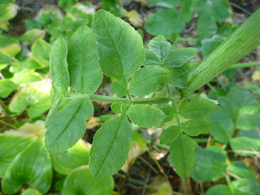 angelica lucida). Leaves are divided several times into somewhat irregularly shaped leaflets, variable in some characteristics; they may be pointed or rounded at the tip, lanceolate or oblong in shape, and have small or large teeth along the edges. Leaves are quite thick; they are colored light green on top and whitish-green underneath, due to a fine covering of tomentose hairs, also found on the leaf stems, stalk and flower pedicels.