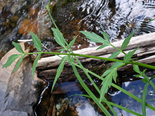 Basal leaves are pinnately divided into closely-spaced lance-shaped leaflets, regular in shape, while upper stem leaves are divided into fewer, narrower leaflets, more widely-spaced. Leaf bases are enclosed by sheaths.