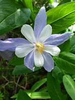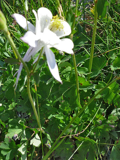 Some flowers of aquilegia caerulea (or aquilegia coerulea) are entirely white, but others have a range of subtle colors including blue, yellow, pink and red, of which light to dark blue is most common. Flowers are large and elegant, consisting of five lance-shaped sepals - the parts more likely to be colored - behind five larger, rounded petals, which extend backwards into a long, thin spur. At the center are many white stamens topped by yellow anthers. Richer and more varied colors are much more common in cultivated varieties; the plant is a popular choice for ornamental gardens. Flowers grow singly or in small clusters, at the end of stalks that have a fine covering of hairs and large, lobed leaves around the base.