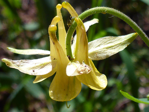 Flowers are nodding, and produced singly at the end of the branches. The five sepals are yellow or pale pink in color, up to one inch in length, and held at 90 degrees. The five petal spurs are yellow, slightly shorter than the sepals, and their tips curve inwards, while the petal blades are similarly colored, and oblong in shape. The outside of the petals and sepals have a covering of short hairs. A group of yellowish stamens and green pistils projects forwards by about half an inch.