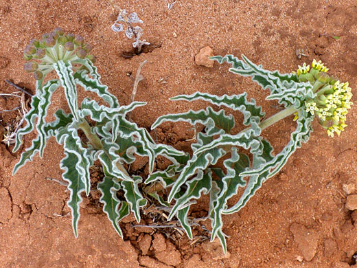 Asclepias involucrata is a low-growing species, inhabiting dry, often sandy places in semi-desert regions. Leaves are quite distinctive, being grey-green in color, wavy along the margins, and partly covered with soft, curly hairs, on the edges and undersides; the upper surfaces are essentially hairless. Plants produce several stems, generally growing at an angle or almost sideways; they may branch a few times, below the middle. The stems have a similar hair covering.