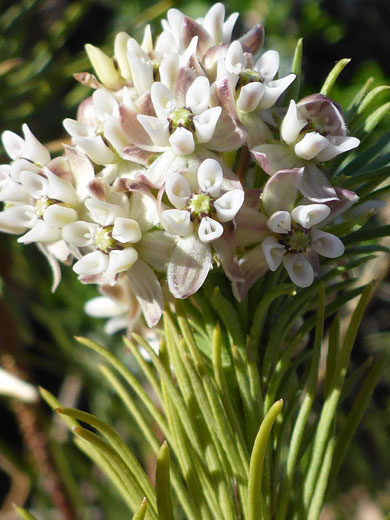 Leaves of asclepias linaria resemble those of a pine tree; narrow, needle-like, crowed all along the stem, and pointing in all directions. Leaf margins are rolled under, and are lined with a few short hairs, most noticeable on young growth. Leaf tips taper to a sharp point.
