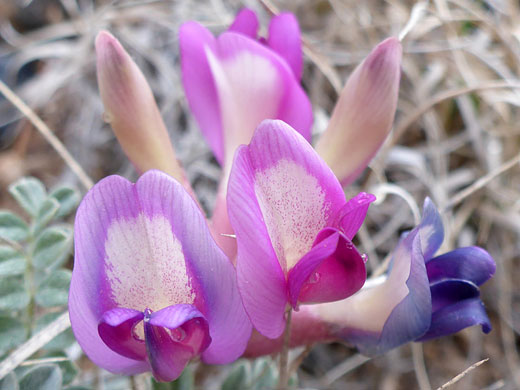 Flowers are about an inch in length, with the outsides also somewhat hairy. The upper banner petal is curved backwards, but not as strongly as for some other species. The edges of the banner are folded back, and its center is lighter in color. Petals become blue as they wither. There are four varieties (amphioxys, modestus, musimonum, vespertinus).