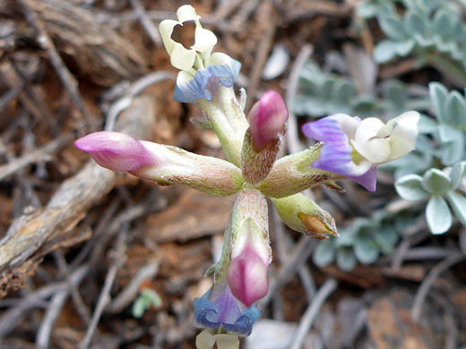 Flower clusters typically contain between 1 and 8 heads. The banner petal is usually bright pink-purple, becoming blue as it withers, while the two wing petals are mostly white - an identifying characteristic of this species. Wing petal tips are deeply notched or lobed. The calyx teeth are relatively long and slender. Fruits are ascending, strigose hairy, approximately three-sided in cross-section, up to one inch long and around 0.15 inches wide. There are three varieties of astragalus calycosus (calycosus, monophyllidius, scaposus).