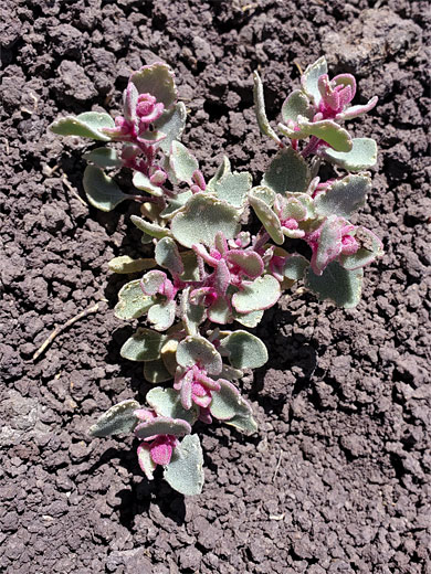 Atriplex confertifolia is a small shrub with woody, thorny branches, which, like the leaves and bracts, have a whitish, scale-like coating. This is a dioecious species; plants may produce male or female flowers, though the two types are similar in appearance, and inconspicuous - tiny yellow blooms in spikes or clusters less than half an inch long, at intervals along the upper stems. More noticeable are the pink or reddish bracts beneath the flowers; these are up to half an inch long, and quite thick. The bracts appear early in the season, followed by the flowers. The plant is most common in arid locations, often in salty soils, but it also occurs in forested areas at elevations up to 7,000 feet.