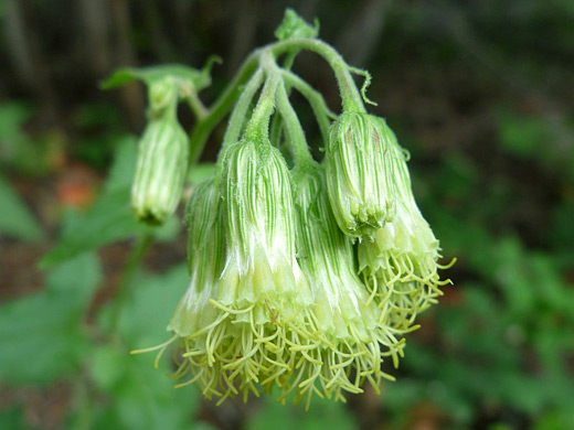 Flowers of brickellia grandiflora are somewhat unremarkable, consisting only of thin, tubular disc florets (20 to 20), pale yellow or greenish in color, which hang downwards in small clusters from the top of a lightly branched stem. Stamens and a branched style protrude beyond the end of the florets when mature. Flower heads are ringed by between 30 to 40 ovate phyllaries in several distinct rows, cream colored (sometimes becoming purplish) with green stripes; the tips are pointed and the margins ciliate.