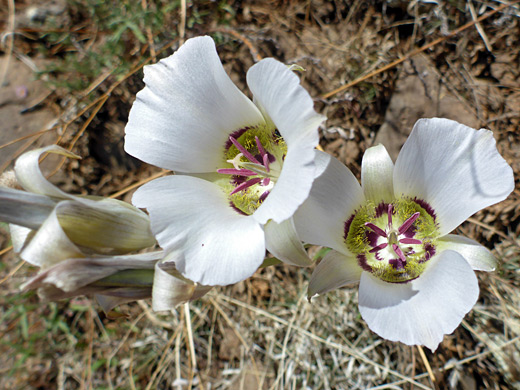 Calochortus gunnisonii is a typically large and beautiful member of the genus; its bell-shaped flowers have three broad, rounded white (rarely pink, magenta or pale yellow) petals and three thin, shorter, greenish, pointed sepals. In the middle is a ring of fine greenish-yellow hairs, below a thin, circular band of purple, all centered on six large anthers and a three pronged stigma. Flowers are about 2 inches in diameter. The thin, bendy stalks bear a few grass-like leaves, and can branch a few times towards the top. Stem and leaves are hairless. Plants sprout from (edible) bulbs, usually deeply buried.