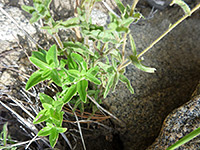 The common name of castilleja applegatei, wavy-leaved Indian paintbrush, describes one identifying feature; the long, lance-shaped leaves have distinctly wavy margins, as well as a covering of hairs, both short and sticky (glandular) and longer, non-glandular. They are crossed by one central vein and two parallel veins, near the edges. Stems are lightly branched, generally between 1 and 2 feet tall.