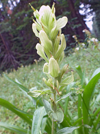 The upper stem bracts are greenish yellow to whitish yellow in color, glandular hairy, and rather shorter and wider than the leaves; more ovate than lanceolate. The bracts may have one pair (less often two) of small side lobes. The tubular corolla is enclosed by a calyx a little less than one inch long, divided into two main lobes, each subdivided into pointed segments. The corolla is longer, up to 1.2 inches, divided into a beaked upper lip and a shorter, narrower lower lip. The corolla contains four stamens.