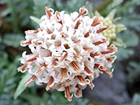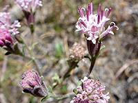 The inflorescence of chaenactis douglasii is white or pale pink at first, becoming dark pink and purple later in the season. Leaves are pinnately divided two or three times into small segments, greyish in appearance due to a covering of fine hairs. Short, stout flower stalks rise a little way above, bearing a cup-shaped involucre supporting a cluster of 50 to 70 disc florets, between half and one inch in diameter. The involucral bracts are glandular (sticky), and also hairy; they occur in one row, and have rounded tips.