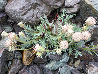 Plants can form quite substantial mounds, a foot or more across. The species is named after David Douglas, a renowned Scottish botanist of the 19th century. Some characteristics are quite variable, and two varieties are recognized. The widespread var douglasii has leaves on the stems as well as at the base, and multiple flowerheads per stem (up to 25), while the high elevation, mat-forming var alpina has basal leaves only, and one (less often two) flowerhead per stem.