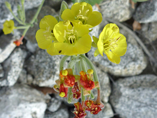 Chylismia cardiophylla can be identified by its wide, soft-hairy, heart-shaped leaves and, in spring, by the bright red withered flowers; the plant blooms over a relatively long period, producing a dense, elongated cluster in which the nodding flowers open gradually, from the base upwards. Old flowers remain attached for a while to the developing, upwardly-pointing seed pods, which are narrow and cylindrical, up to 2.5 inches in length.