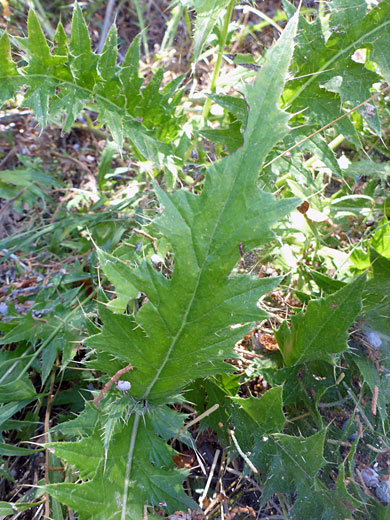 The stout, reddish-green stems are often completely hairless but can have a covering of fine, cobwebby hairs. Leaves are variable, in shape and hairiness. They may be unlobed, shallowly lobed or deeply divided, while the lobes may be further divided. Lobes are linear to ovate in shape, and spine-tipped. Surfaces may be hairless, or sparsely to densely covered by short, greyish hairs.