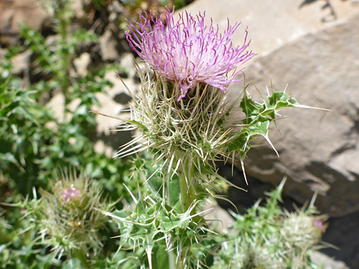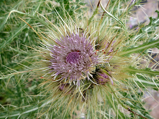 All thistles are prickly, but cirsium eatonii especially so, particularly towards the tip of the stems, where the flower heads, involucral bracts and uppermost leaves all combine to create a large spiny cluster. The colorful component is the dense cluster of tubular, lavender pink disc florets, usually pointing upwards; beneath is a cup-shaped involucre, green in color, bearing a regular array of purplish bracts (phyllaries), both hairy and spiny. The styles of the flowers have a slightly lighter shade of pink, and project well beyond the end of the tubes.