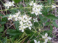 Clematis ligusticifolia is a creeper, or a vine, with woody stalks that grow upwards and sideways and are densely covered with both flowers and leaves; they often spread on top of other vegetation, forming a tangled thicket. Flowers are light cream or pure white in color, a little less than an inch in diameter, have 4 or 5 sepals (no petals), and a center of long, protruding stamens or pistils - both numbering in the range 25 to 50. Pistils are followed by long, feathery seeds.
