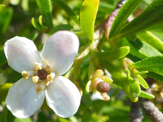 Cneoridium dumosum, a monotypic species, is mostly restricted to the beaches and hills around San Diego in far south California, the range extending north towards Los Angeles. Plants are densely-branched shrubs, with linear, evergreen leaves, hairless, unlobed and untoothed, dotted with light-colored glands, which contribute to the citrusy aroma.