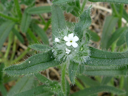As well as the nutlets, the leaves of cryptantha species provide the best means of identification. Those of cryptantha barbigera are relatively broad, up to half an inch across at the base, and have quite a dense covering of spreading, bristly white hairs, most evident along the edges. Leaf surfaces are somewhat irregular in color, flecked with slightly darker green patches. A prominent vein runs down the center. Leaves may be whorled, opposite or alternate.