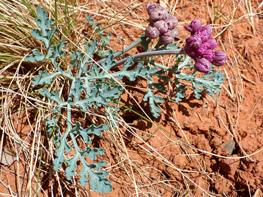 Leaves of cymopterus multinervatus are typical of many members of the apiaceae family, being finely dissected into small, rounded segments. They are grey-green in color, relatively thick, and grow from the base. Plants produce several leafless flower stems, a little longer than the leaves, each topped by a compact, spherical cluster of small flowers. All parts of the plant are hairless. Leaves and stems tend to grow sideways or at an angle rather than vertically upwards.