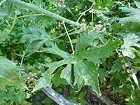 The species name of delphinium glaucum refers to the stems, which are glaucous; the surface has a greyish-green coating. Plants usually produce several stems, which can reach a height of eight feet or more, but are usually about half this. Stems and leaves are hairless. Leaves are divided into several relatively wide lobes - often around five - which are lined by large, sharp teeth of varying sizes.