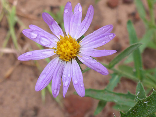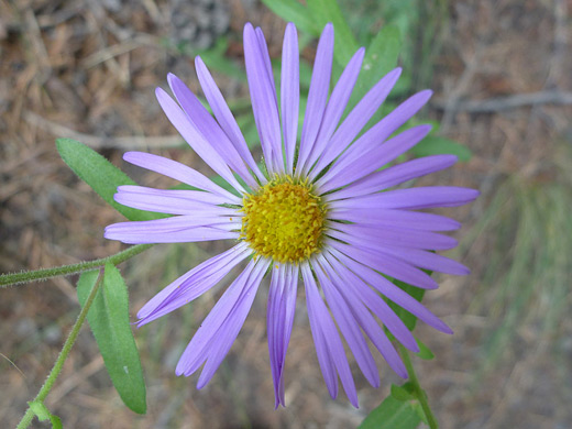 dieteria canescens, or machaeranthera canescens, are lavender pink to purple in color, growing profusely on tall, branched stems bearing narrow, well-separated leaves. Stems and leaves have a sparse covering of short hairs. Each bloom has around three dozen ray florets (half an inch long) and a yellow center composed of many small disc flowers. The involucre bears neat rows of phyllaries which are somewhat sticky, green in color but whitish at the base; this is one aspect which differentiates the plant from