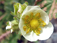 Stems are topped by an open cluster of up to 40 flowers, held above the leaves. Flower stalks are up to one inch long, and glandular hairy, as are the five green sepals, often red-tipped. Flowers tend to open widely, with petals and sepals held at around 90 degrees to the stem; the white or pale yellow petals are non-overlapping, ovate to obovate in shape, sometimes shallowly notched at the tip. Sepals and petals are approximately equal in length; up to 0.3 inches. The yellow stamens have thin filaments and rounded anthers, and are arranged around a dome of tiny green to yellow carpels.