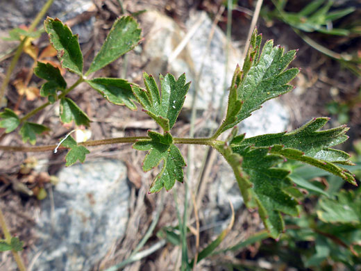 Leaves of drymocallis convallaria are divided into a terminal leaflet and well separated pairs of side leaflets; those at the base usually have three or four pairs, while stem leaves have exactly three. The terminal leaflet is obovate in shape. Leaves are dark green above, lighter green below, and they have a sparse covering of very short hairs. Leaflets are lined by large teeth, each terminating in a tiny red spike. Stems have a dense covering of hairs, supporting spherical glands.