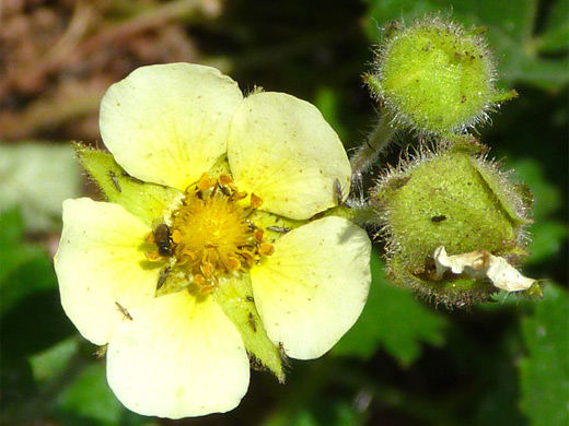 Drymocallis glandulosa is usually a small, low-growing plant characterized by the fine, sticky, glandular hairs that cover the stems, involucres and buds. In some locations, however, it may reach heights of 3 feet or more. Flowers have five-fold symmetry; five petals, mostly white to pale cream but yellow at the base - generally paler than many similar species - underneath which are five pointed, pale green sepals. Petals vary in shape from round to narrowly obovate, and they are generally not overlapping. At the center of the flower is a cluster of 25 to 40 stamens and pistils.