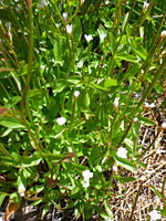 The opposite leaves are lined by tiny, well-separated teeth, and have a few hairs along the margins but are otherwise glabrous. Stems have a covering of short, strigose hairs, arranged in vertical lines; hairs are most dense towards the base. Plants form small clumps, branching from the base.