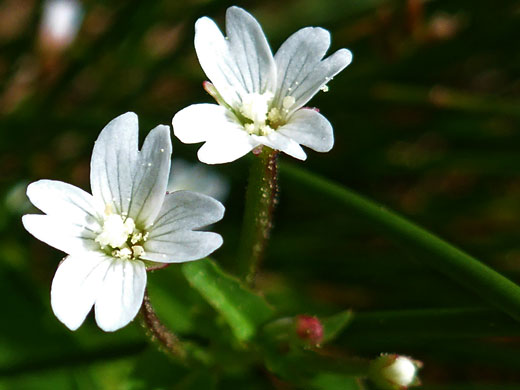 Pedicels, ovaries and sepals are sparsely covered by short, glandular hairs. The petals are about twice as long as the sepals, up to a third of an inch. Petals are notched at the tip and crossed by a few branched veins.