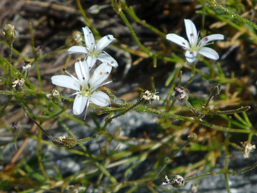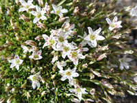 Eremogone kingii is a high elevation species, found in most mountainous areas of the West, up to elevations of 13,000 feet or more. Like most such species, plants are low-growing, only around six inches high, and the leaves are small - needle like, forming tufts at the base and along the stems. Stems may be hairless or (more usually) covered by short, glandular hairs.