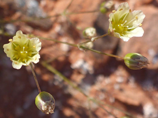 The inflorescence is an open cluster, of between three and 20 flowers, the branches angled upwards. Pedicels are up to 1.5 inches in length. The five sepals are elliptic to broadly lanceolate, hairless to sparsely glandular, with thin, light-colored margins. Petals are pale yellow to white, up to twice as long as the sepals, slightly wavy along their upper edge. Stamens are about as long as the petals.
