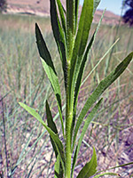 Plant height can exceed ten feet in favorable locations, though five or six feet is more usual. Stems are much branched, mostly along the upper half, and they have a light covering of strigose hairs. Leaves are narrow, and angled upwards, staying close to the stem, especially towards the top. Leaf faces are glabrous, while the margins and sometimes the veins are lined by short hairs. Leaf edges may have a few small teeth; this is more likely for leaves lower down the stem.