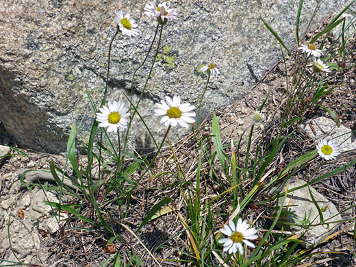 Identifying characteristics of erigeron eatonii include the generally broader and less numerous ray florets compared to most other daisies, and the leaves, which are narrow but wider towards the tip, and are crossed by three parallel, lengthwise veins. Ray florets number between 16 and 42, usually colored white, less often purple or pink, around a center of disc florets, initially greenish, then yellow. Rays are about a third of an inch long. There are two rows of phyllaries, similar in length, curving outwards at the top. Phyllaries are covered by straggly white hairs, and may be slightly glandular.