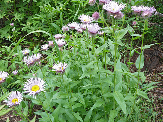 As its common name implies, erigeron elatior is somewhat taller than other fleabanes in its habitat of open areas and high elevation meadows - up to 2 feet. The phyllaries are also distinctive; they are long and thin, linear in shape, green or purple in color, and lined with long hairs, longer than the phyllary width. They are angled outwards or curved back down, often with an irregular arrangement. Phyllaries are slightly glandular. Flowerheads contain between 75 and 150 narrow, pinkish-purple ray florets, their corollas nearly one inch long, around a center of about twice that number of orange-yellow disc florets.