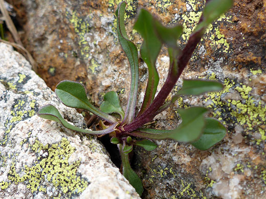 Plants produce one flowerhead per stem, at a height of up to 8 inches, though only up to 5 inches at higher elevations. Stems are usually purplish, and hairy towards the tip; the hairs are also mostly black. Leaves grow at the base, and sparingly along the stems. They are usually no more than 2 inches long, but up to 4 inches in favorable locations at lower elevations. Stem leaves are linear, and often somewhat twisted. Leaf faces are usually hairless. Leaf edges may have fine teeth, and are often purplish. Leaves have a prominent midvein, and no side veins.