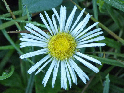 erigeron subtrinervis. The reddish-green stems may also be hairless, or sparsely hairy, with hairs less than 1/20 of an inch long. The plant is found over a wide range, from Canada to Arizona.