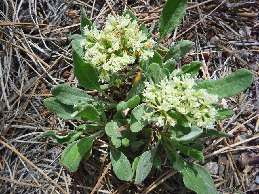 Yellowish flowers and hairy green leaves; James' buckwheat (eriogonum jamesii) in Bandelier National Monument, New Mexico