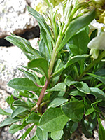 Long (up to 5 inches) and narrow (lanceolate), in a rosette around the base and along most of the stem. The edges may have a few small, well-separated teeth