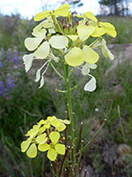 The sanddune wallflower, erysimum capitatum, produces a thick, rigid, grooved stalk, usually unbranched, with a closely-spaced cluster of flowers at the top, usually colored orange, gold or yellow; each has four oval-shaped or rounded, lightly veined petals, generally not overlapping. Occasionally plants may have pink, red or even white flowers. Flower heads are about 1 inch across. Buds are green, becoming brownish at the tip as they mature. Leaves are most numerous around the base but are found most of the way up the stem. Fruits are long (up to 4 inches) and very narrow, angled vertically upwards, brownish in color and not constricted between the seeds.
